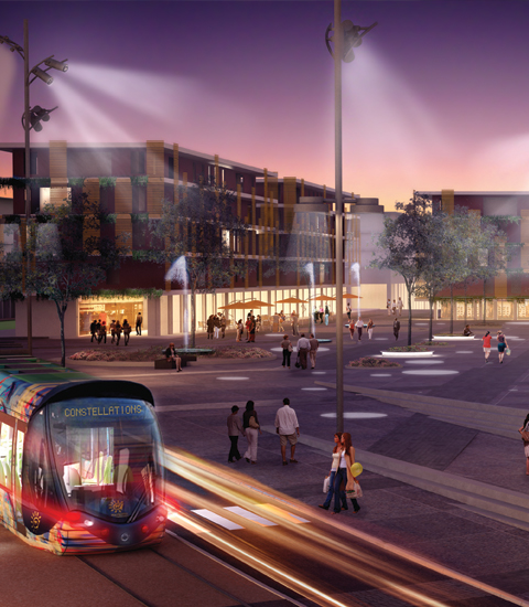 Tel un village dans la ville, “Les Constellations” incarne un nouveau lieu de vie, de rencontre et d’échange. Au centre du quartier, la place publique accueille le terminus du tramway, une aire de stationnement pour les vélos, et rassemble les commerces et services de proximité indispensables au quotidien.